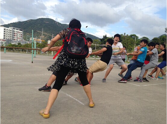 比赛场上只见参赛的同学们一个个相互鼓励,脸上闪动着坚定的神情。随着哨声响起队友们喊着“一二三,一二三”的口号向自己方向拼命拉绳,班内其他同学也自发的组成拉拉队为本班的同学加油着,赛场上欢呼声,呐喊声此起彼伏,处处洋溢着青春的滋味。尽管天气十分炎热,但前来助威加油的人仍不在少数,使赛场氛围十分热烈。最后以