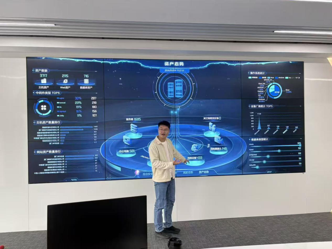 在数字化展厅,技术人员重点展示了“资产态势”可视化大屏,对主机、Web、数据库等各类资产数量及分布进行实时解析,涵盖中间件类型、操作系统、设备厂商、数据库品牌等维度的统计排行,并通过拓扑结构呈现服务器、办公终端、网络设备的关联,系统阐释了从资产测绘到风险监测的主动防御理念。这一环节让师生对安全运维由被动响应转向主动感知的趋势有了具象化理解。