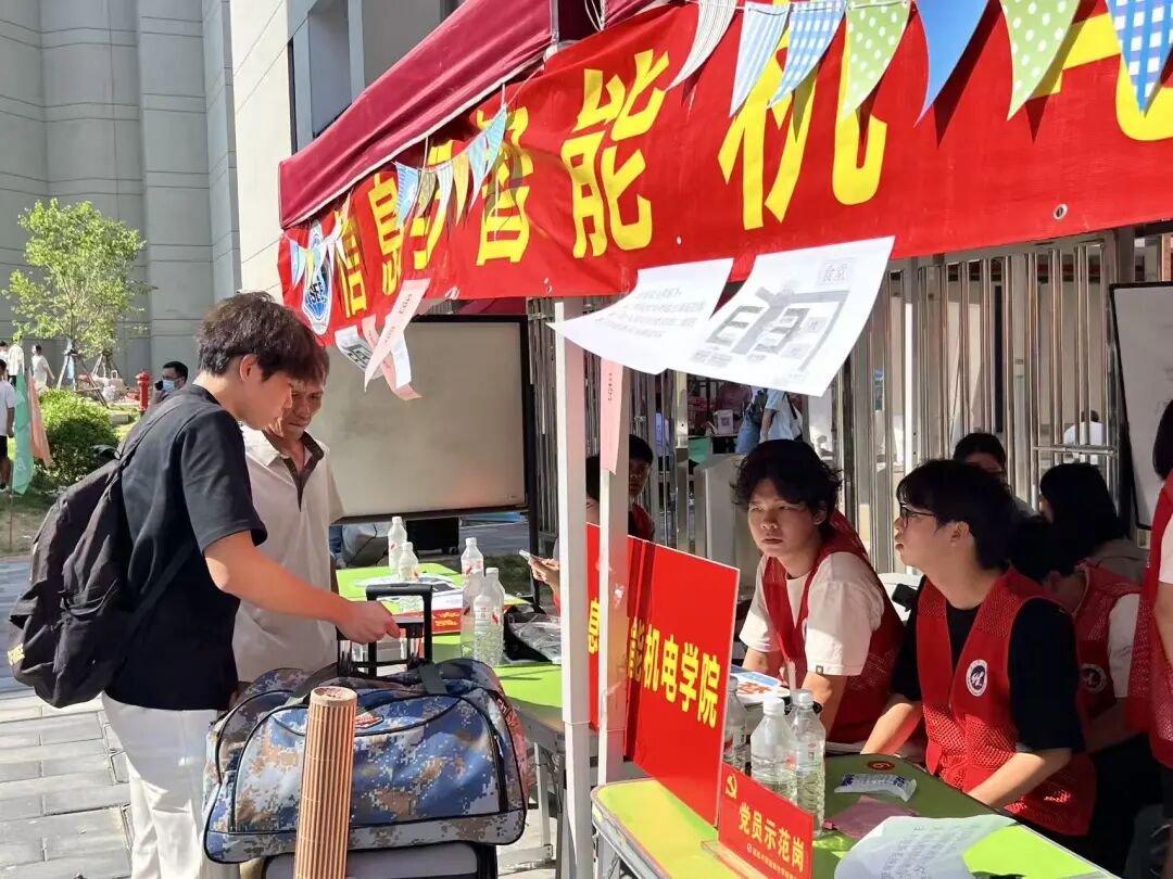 迎新现场,红色的“党员服务岗”格外醒目,党员志愿者们身披红色马甲穿梭在各个角落。他们主动上前接过新生手中的行李,积极协助新生完成迎新系统信息采集、宿舍入住等流程,耐心解答家长关于校园生活、宿舍管理的疑问。尽管夏日炎炎,汗水湿透了衣衫,参与活动的师生党员及入党积极分子始终保持饱满的服务热情,立足岗位践行着“全心全意为人民服务”的根本宗旨,展现了“我为群众办实事”的良好作风。